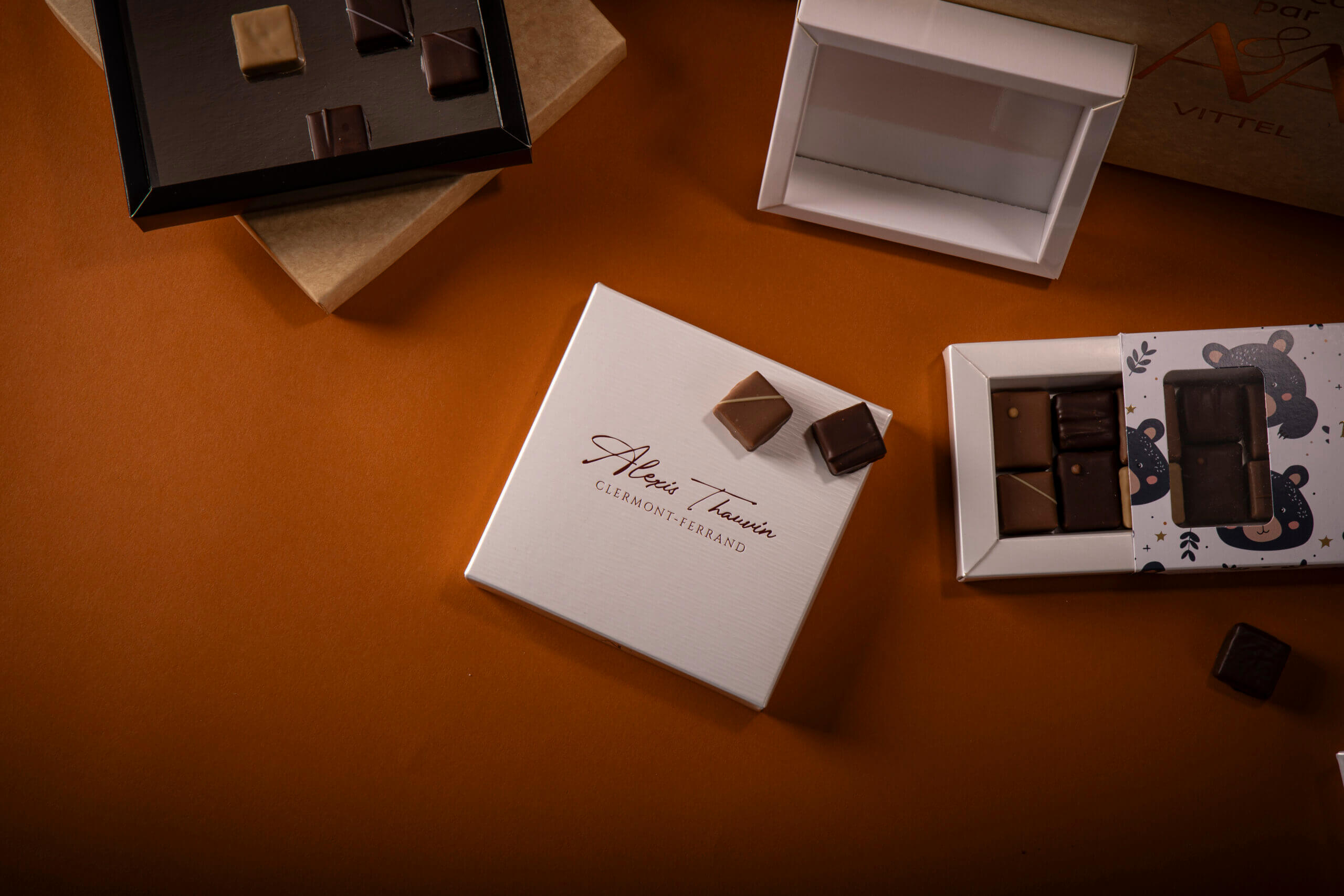 Confiserie, Chocolat & Biscuits : emballages premium, personnalisables avec finitions haut de gamme (dorure, gaufrage, vernis sélectif, …).